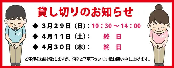 ■ 3月29日(日)10時30分~14時00分まで貸切りとなります。